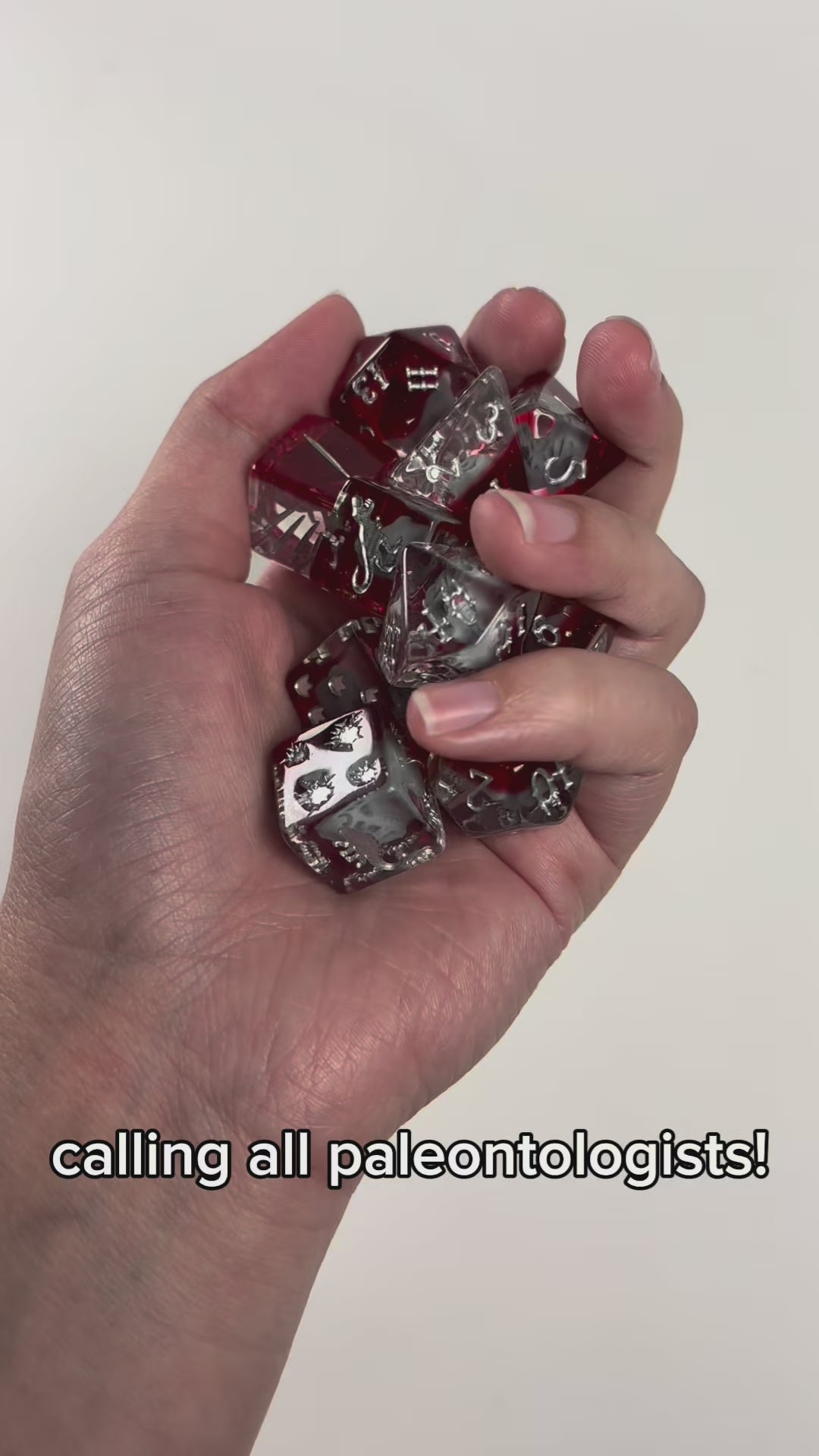 Note: Each shape contains a tiny t-rex skull resting on the base layer. The skull inclusion is made of resin and will not bias the dice rolls to a noticeable degree.