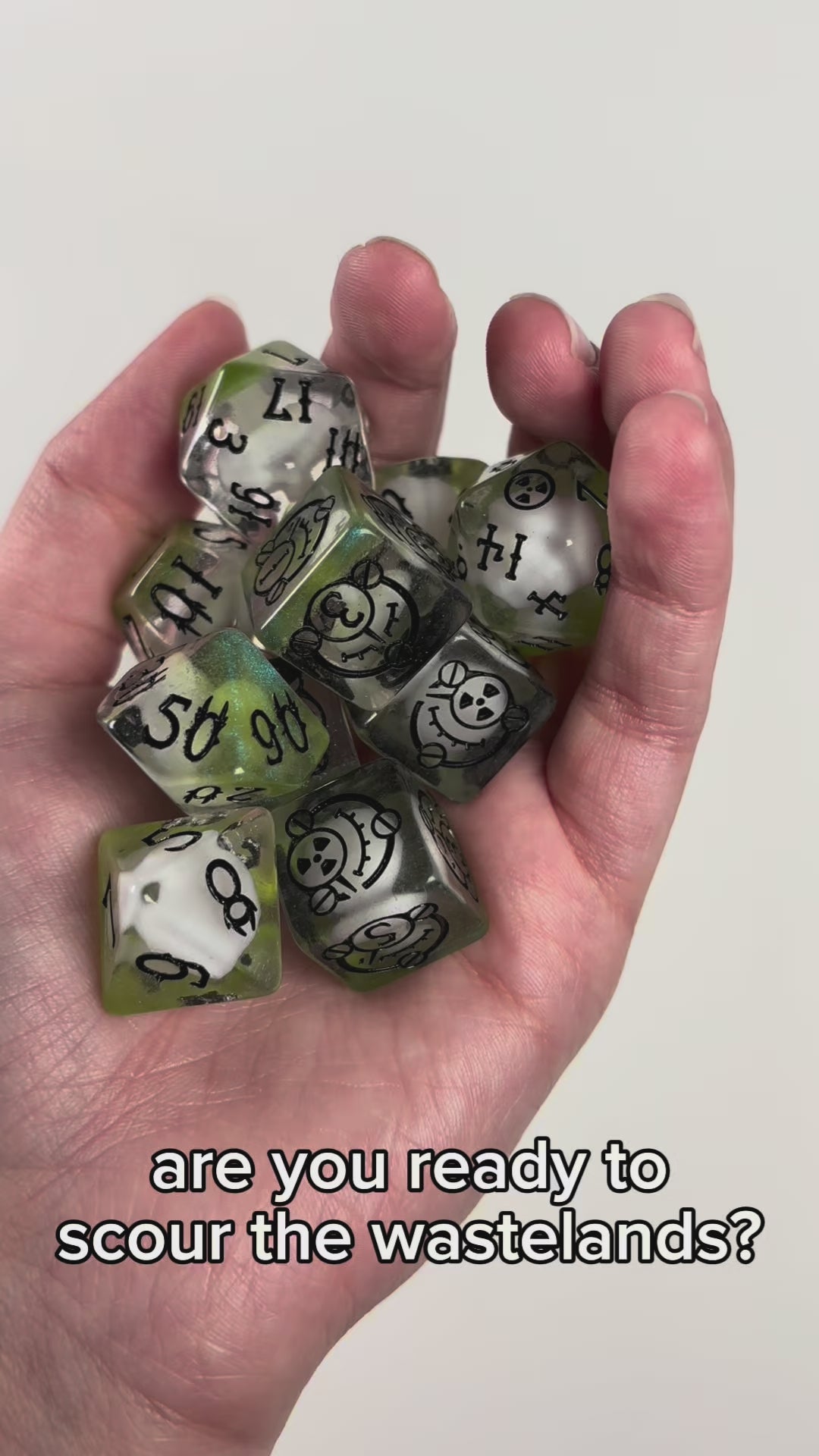 Note: Each shape contains a tiny mushroom cloud inclusion resting on the base layer. These nuke clouds are made from a resin nearly identical to the dice material and will not affect the quality of the rolls to a noticeable degree.